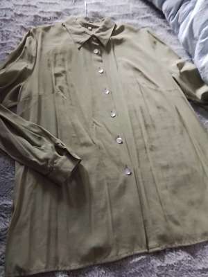 Damenkragenbluse Langarm, Größe 46/48 Oberweite 62 cm, Länge 72 cm, Farbe: Erbsengrün, Perlmuttknöpfe